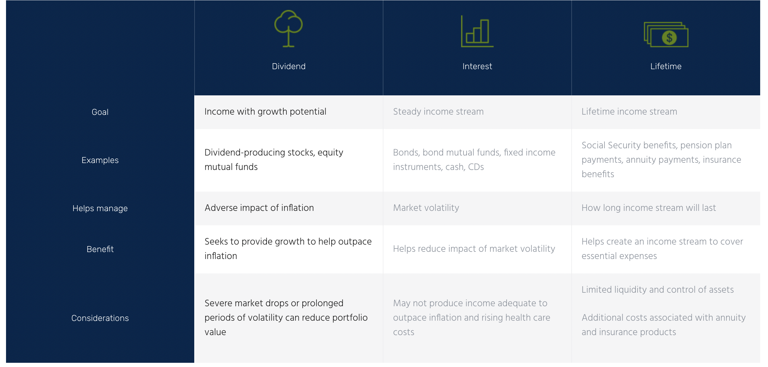 As you think about the retirement income sources available to you, begin grouping them into income categories such as lifetime, dividend, and interest income. Because of their predictability, many retirees use lifetime income sources to cover essential living expenses. Discretionary and unexpected expenses are generally more flexible than essential expenses, so your investable assets can help cover these costs.